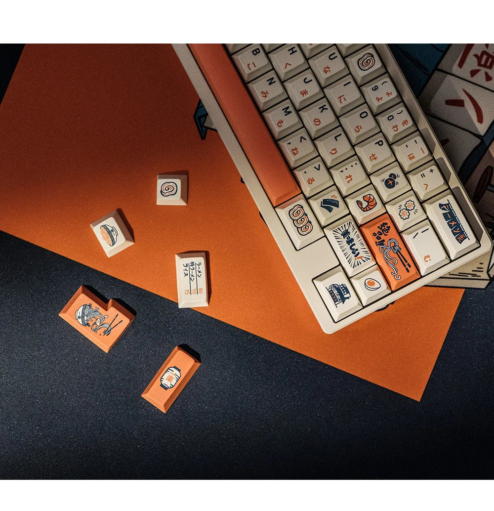 The vintage white keycaps are paired with striking orange accents and intricate Japanese iconography. Each novelty key features ramen-themed artwork that adds a layer of cultural authenticity to the desktop.